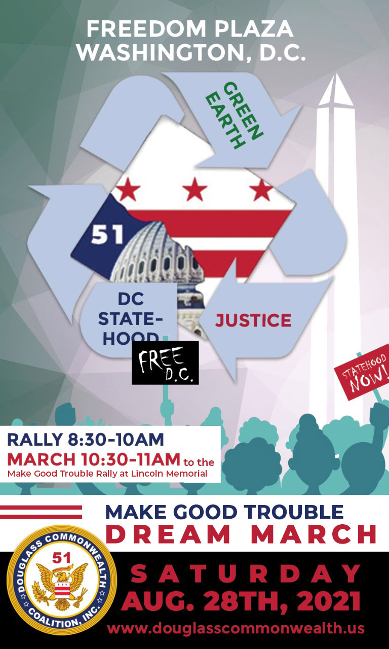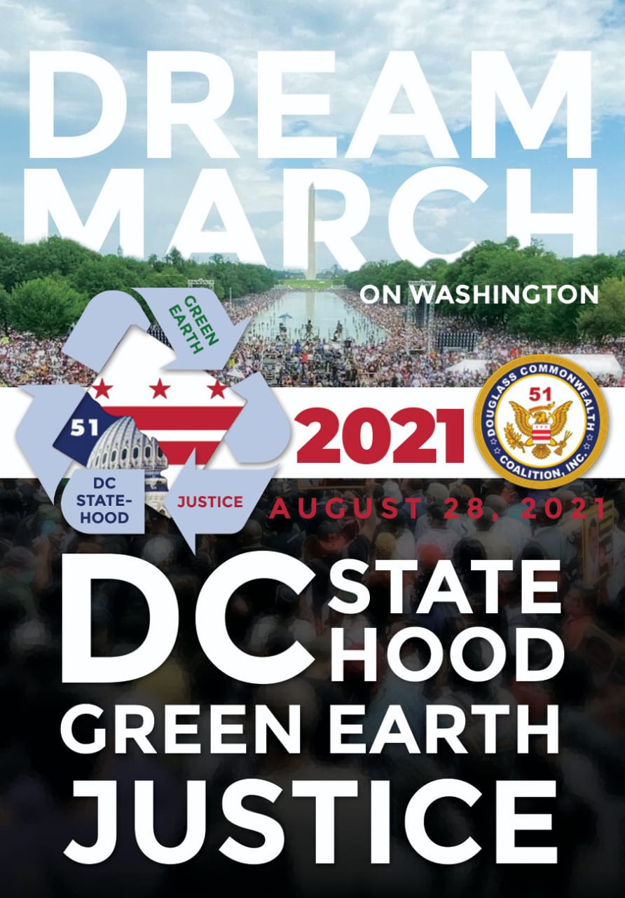 The Dream March on Washington For D.C. Statehood, Green Earth, and Justice – the Three-Issue Alliance – is organized to commemorate the 1963 “March on Washington for Jobs and Freedom.” March participants will include elected officials, individuals, and sponsoring organizations that support the three issues. All participants are asked to commit to pursuing a unified agenda that prioritizes D.C. statehood, a Green Earth, and Justice for all. The commemorative weekend will feature three days of events and a Virtual March.